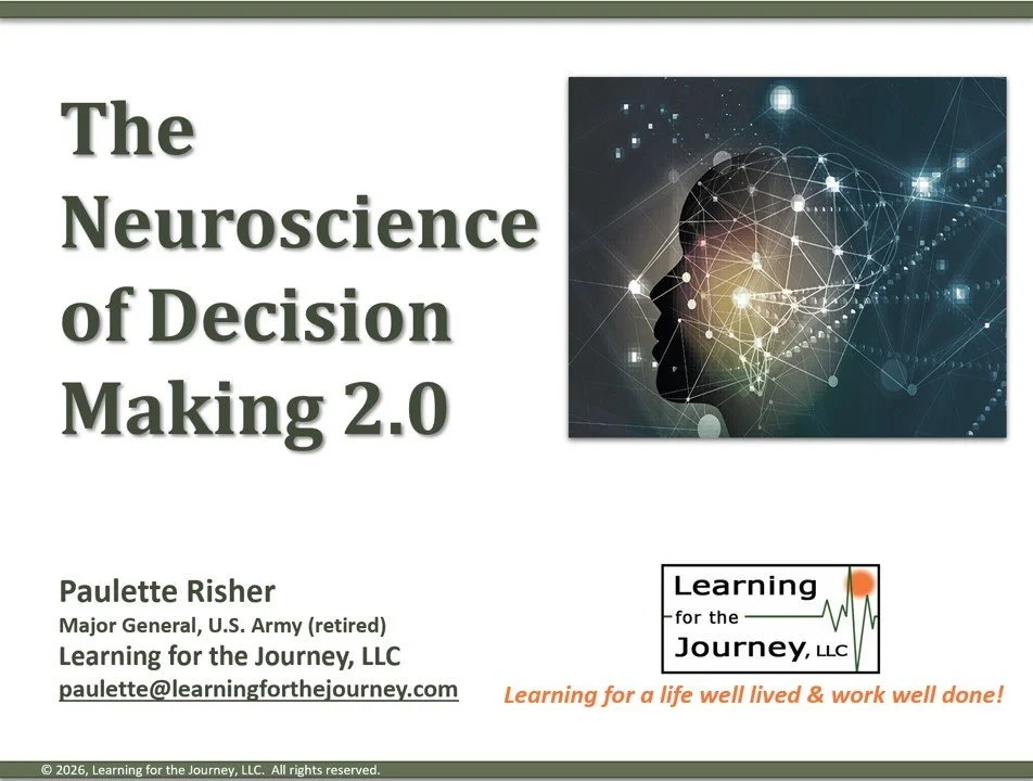 Paulette has also been invited multiple times to present a “one hour block” of instruction and discussion on the Neuroscience of Decision Making. This presentation is well-suited to professional audiences in a variety of settings including conferences, classes, workshops, and “lunch and learns.” It may delivered in person or virtually. The presentation content is research-based, sophisticated and yet, professionally and personally useful. Just click on the image below for a .pdf file of the presentation.
