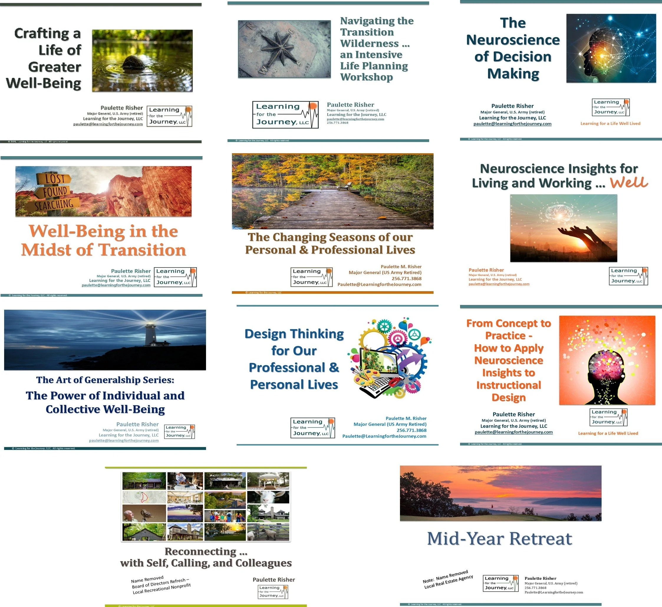 Learning for the Journey, LLC is a “passion project” of twice retired Paulette Risher. Paulette is a retired Army Major General, with 34 years of active and Reserve service and a retired Air Force civilian organizational psychologist. Additionally, she served as the President/CEO and Chief Programs Officer of a well-respected Veteran non-profit for almost a decade.